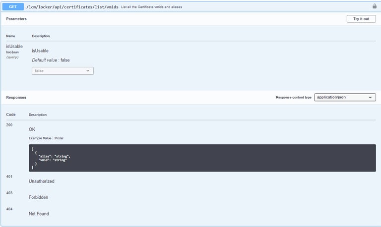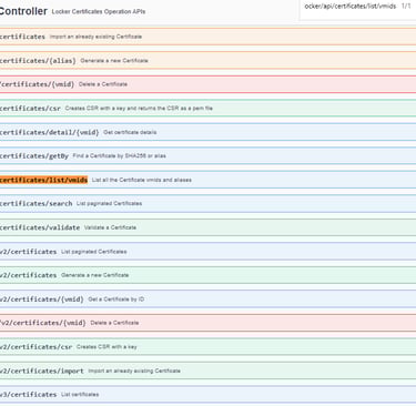Scroll down to Locker Certificates Controller, where you’ll find the API endpoint /lcm/locker/api/certificates/list/vmids, which is used to list certificates.