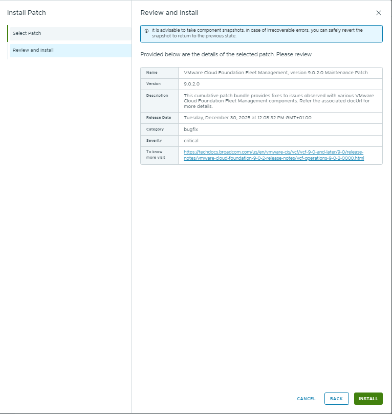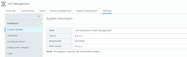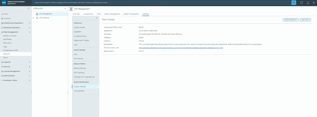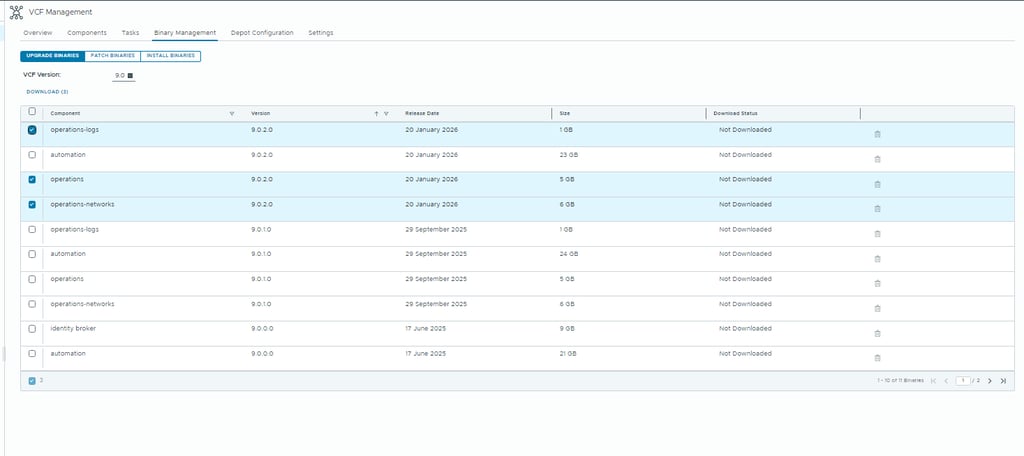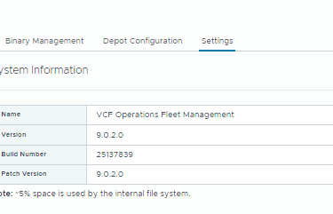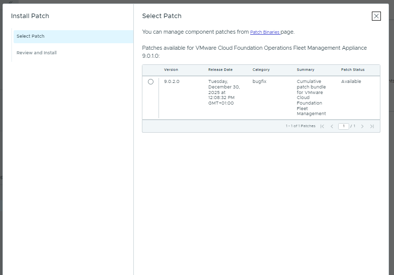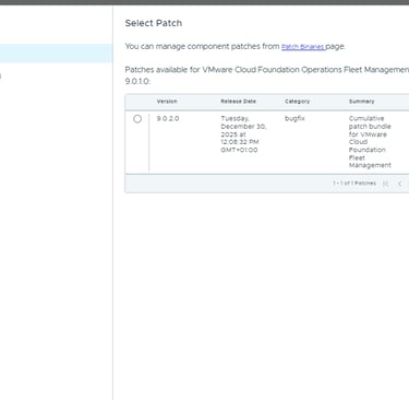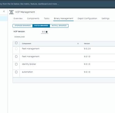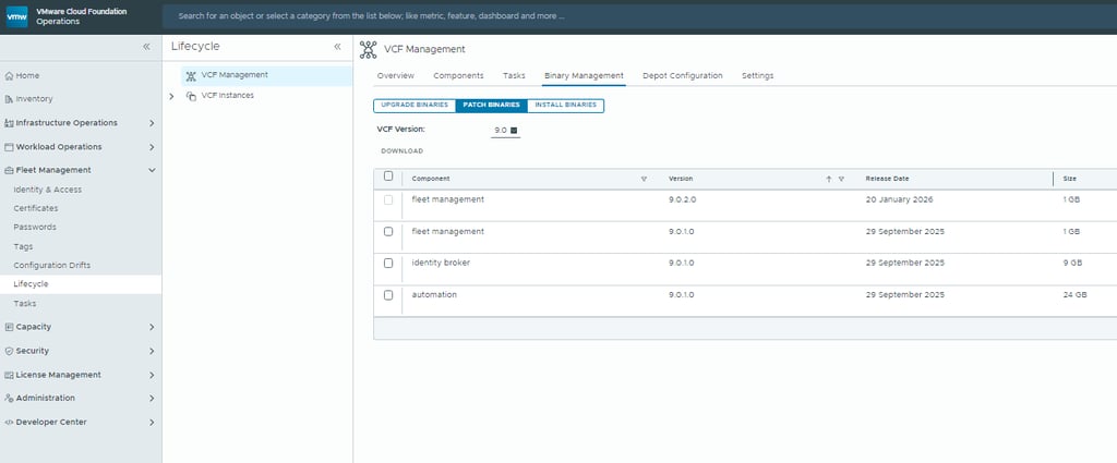 Note: Patch binaries for VCF 9.0.2 are not available until the Fleet Management appliance itself has been upgraded.