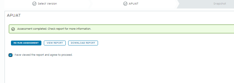 Once the APUAT checks are complete, review and validate the report, then proceed with the upgrade. After clicking Upgrade, the cluster will temporarily go offline. Parts of the process can still be monitored through the Admin UI.