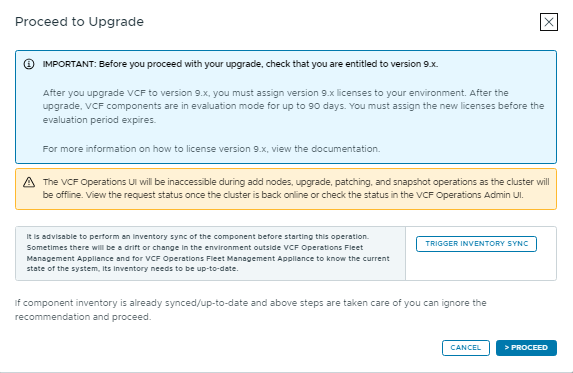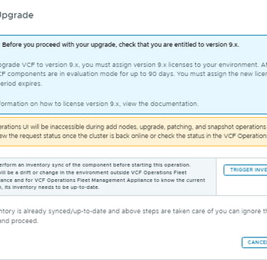 Click Upgrade VCF Operations. A details pane will open with important information that should be reviewed carefully. As a best practice, make sure to run Trigger Inventory Sync before starting the Upgrade.