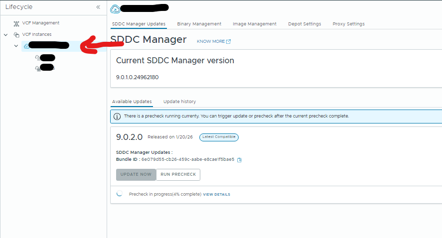 Navigate to Fleet Management → Lifecycle → VCF Instances, then select the VCF environment you plan to update. From here, run the precheck workflow to validate that all dependencies, health states, and configuration requirements are in place before proceeding with the lifecycle operations.