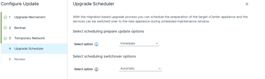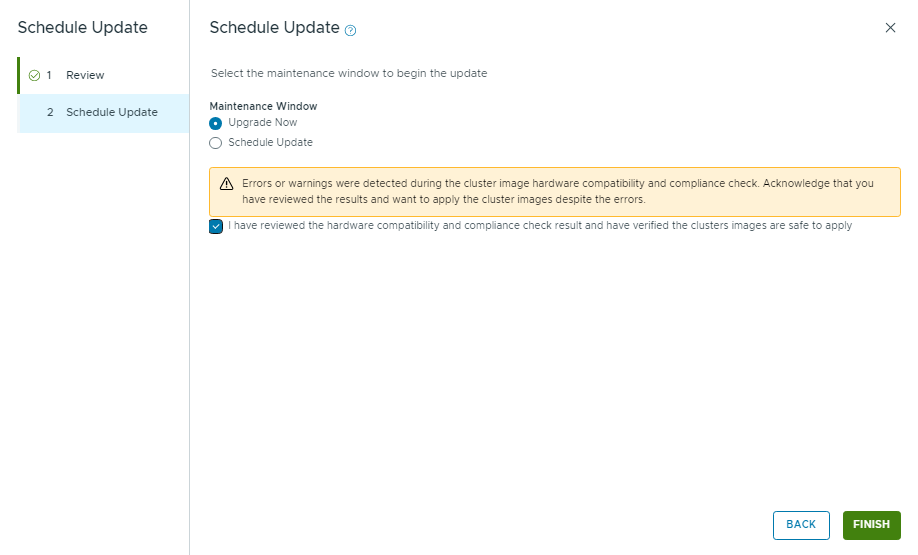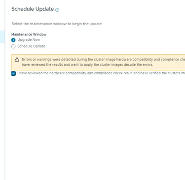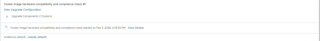 After the precheck completed successfully, I moved on to scheduling the upgrade to start the ESXi host update process.