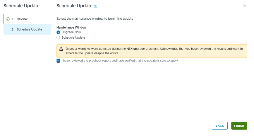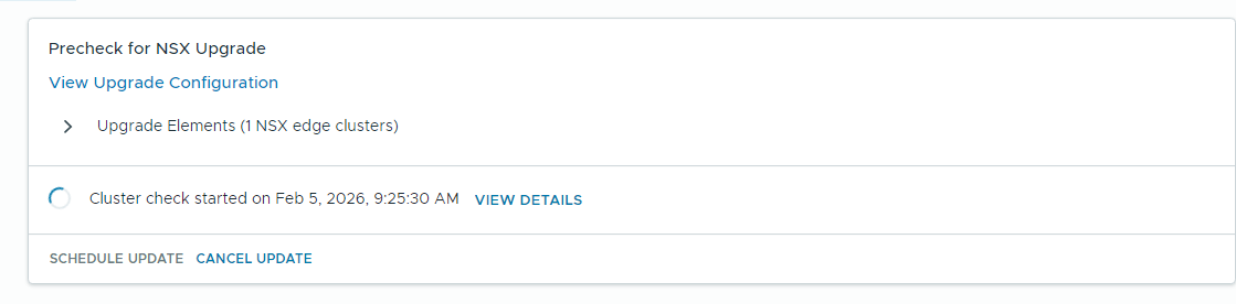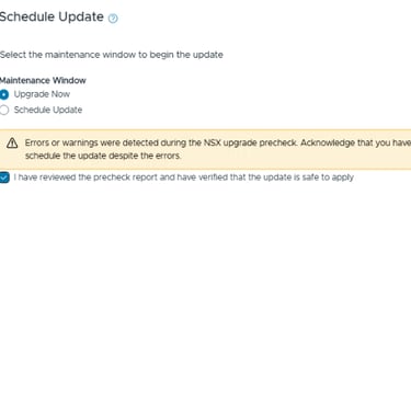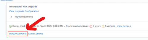 Next, you can start the NSX upgrade. Click Schedule Update to define when the upgrade should begin, allowing you to choose a suitable maintenance window before the process starts.