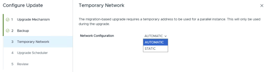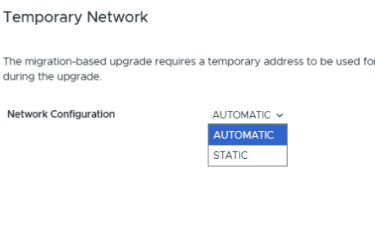 With VCF 9.0, this workflow is much simpler. The platform now assigns a temporary IP automatically during the upgrade, using a link-local network (169.254.0.0/16) that is established directly between the source and target vCenter VMs. This removes the need for manual IP planning and reduces the risk of configuration errors during the upgrade process.