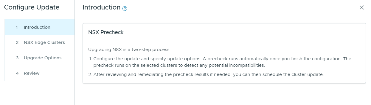 Click Configure Update to begin. The process starts with the NSX Precheck, which gives you an overview of the upgrade workflow and validates that all prerequisites and environmental requirements are met before continuing with the upgrade.