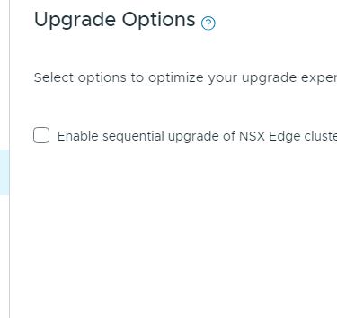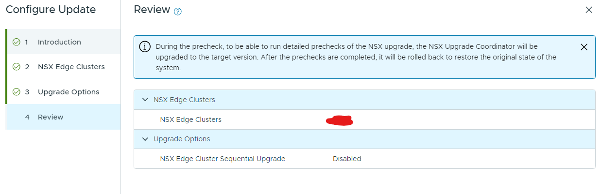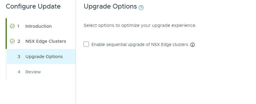 After selecting Configure Update, NSX will first run through a Precheck phase followed by the Upgrade Options step, where you review and confirm the upgrade settings before the process continues.