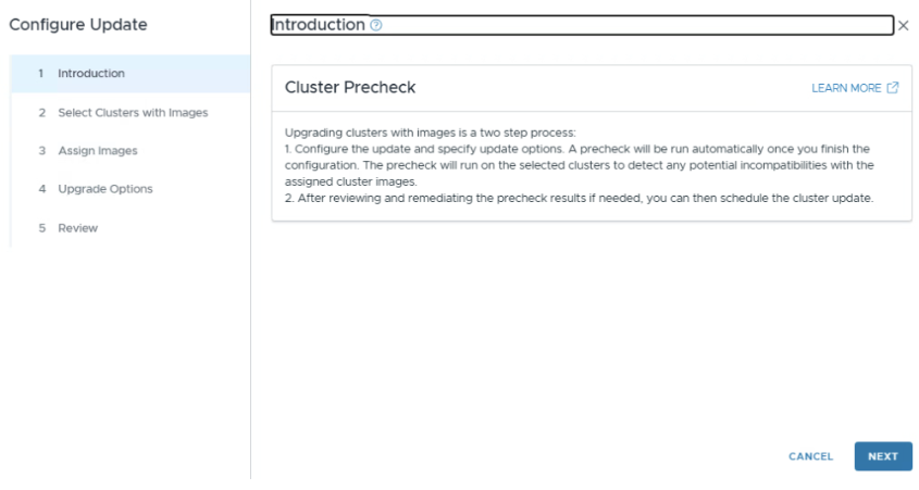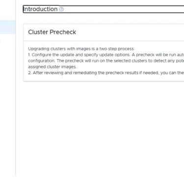Start by running a Precheck to verify that the environment is ready for the upgrade. This step validates dependencies, health status, and configuration requirements, and should always be completed before proceeding.