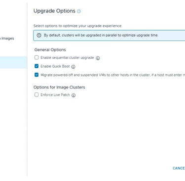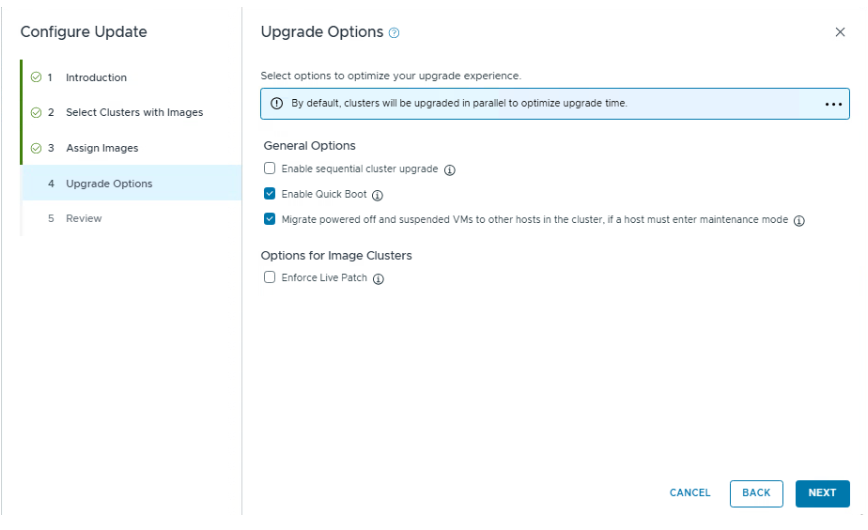 The Upgrade Options allow you to optimize how the upgrade is performed. You can enable Quick Boot to reduce host reboot time and choose to automatically migrate powered-off or suspended VMs when a host enters maintenance mode. By default, clusters are upgraded in parallel to help minimize the overall upgrade duration.