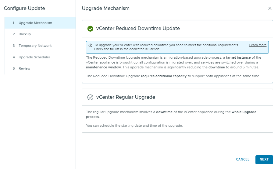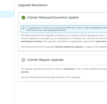 The first option is the upgrade mechanism, where you can choose methods that help reduce vCenter downtime during the upgrade. I chose the regular upgrade since this is a POC enviroment.