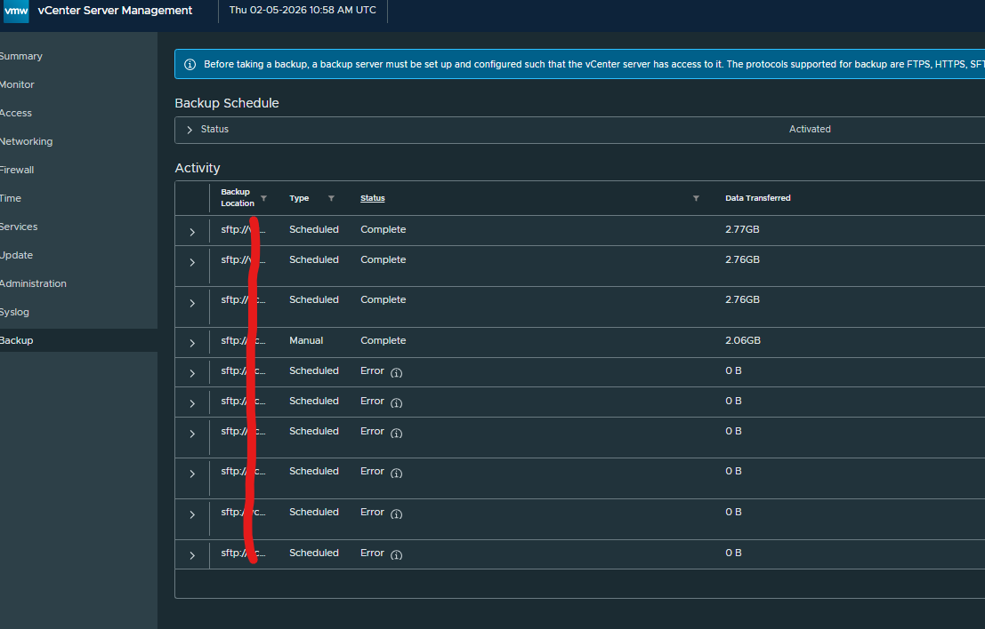 Next is the backup option. Always verify that a valid backup of the vCenter Server exists before proceeding. Check VAMI for successfull backup. After confirming this, click Next to continue.